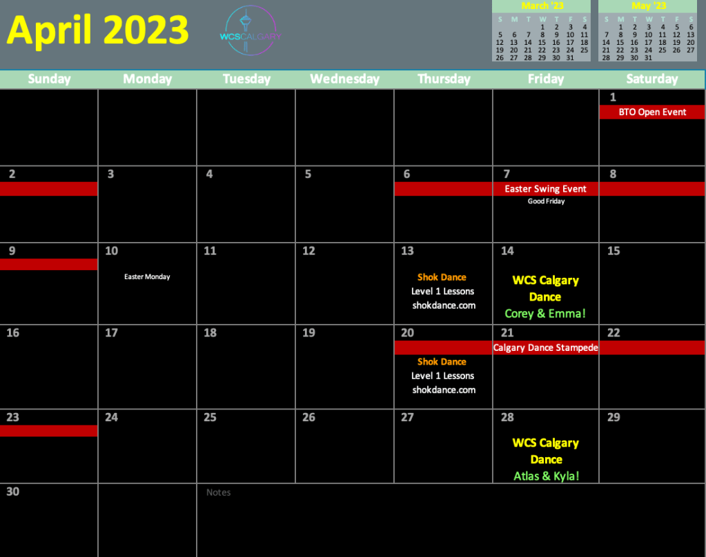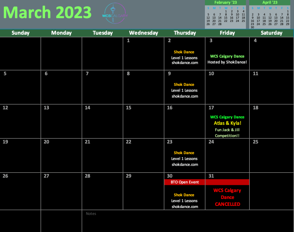 February, March & April WCS Calendars! February 6, 2023 / wcscalgary West Coast Swing Calendars for the next 3 months! So much dancing coming up!