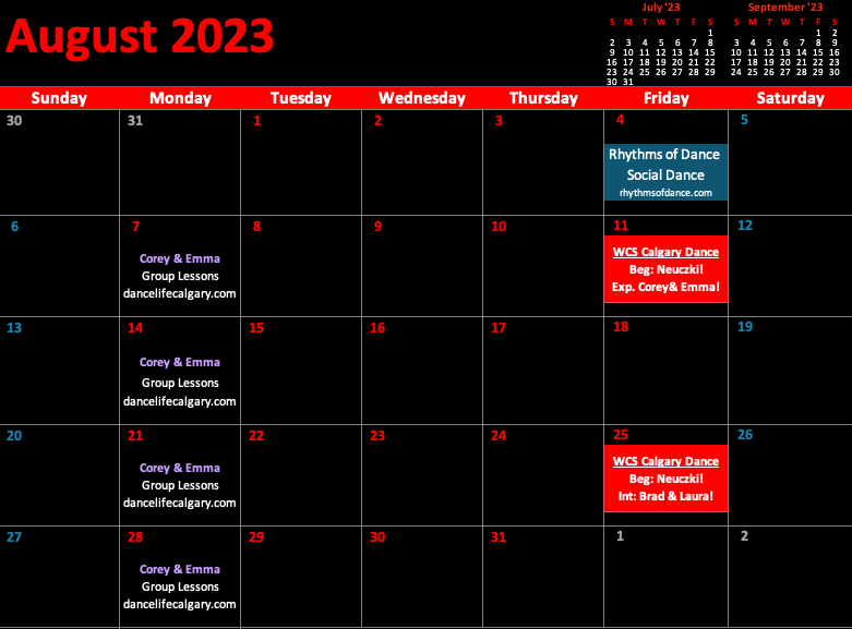 August Dance Calendar! 🔥 August 4, 2023August 4, 2023 / wcscalgary Check out the following links for more details on the other studios events: https://www.rhythmsofdance.com/ https://www.dancelifecalgary.com/