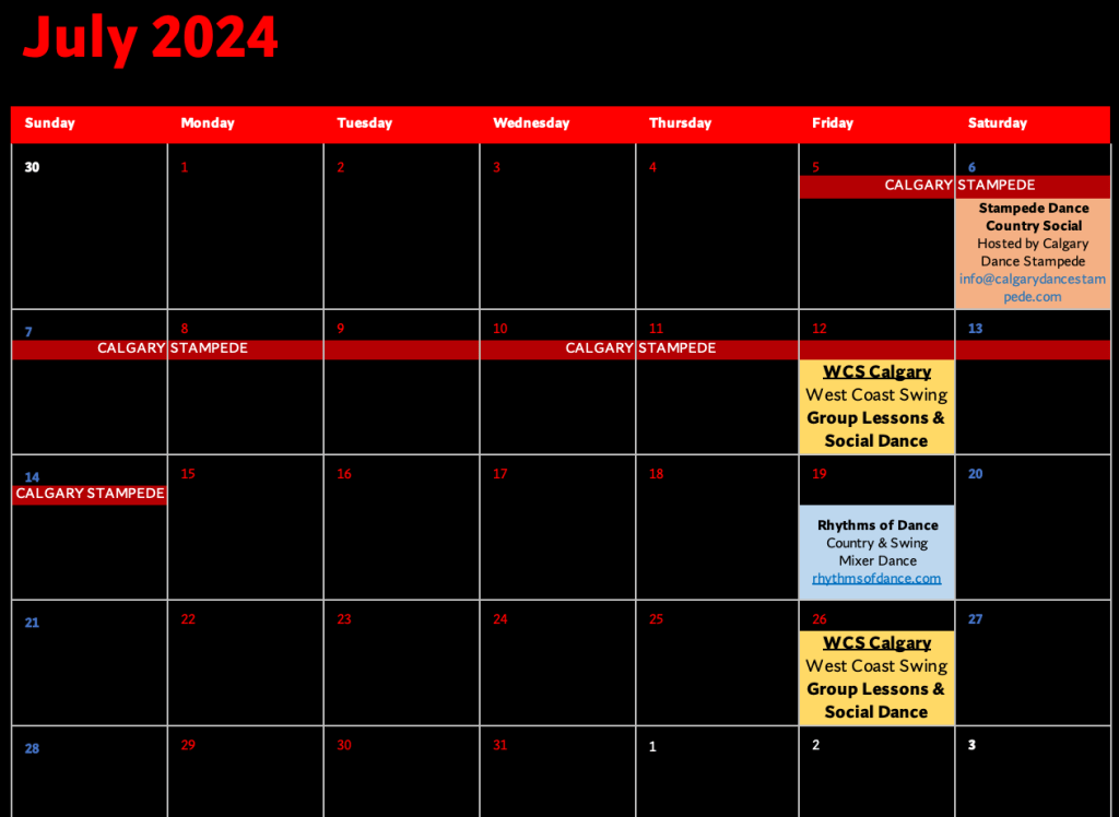 July Calendar! June 20, 2024June 25, 2024 / wcscalgary Here are the upcoming West Coast Swing events for July! 📌