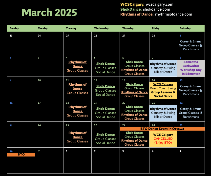 February & March WCS Dance Calendars! 🗓 February 13, 2025February 13, 2025 / wcscalgary Here’s what’s going on in the Calgary WCS world for the next 2 months! 😁