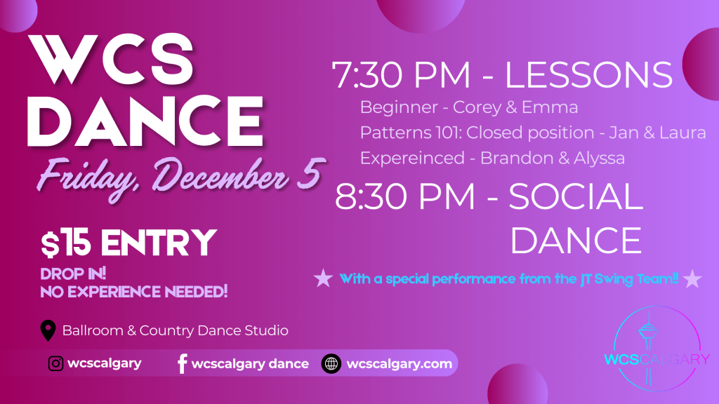 Join us on Friday, December 5th, for a great night of West Coast Swing Dancing!β¨