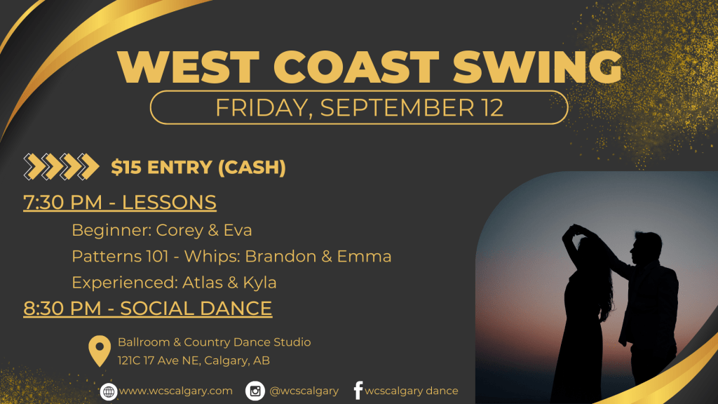 Join us on Friday, September 12th, for a great night of West Coast Swing Dancing!✨